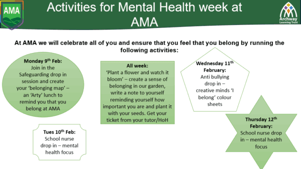 This week is Children’s mental health week, with the theme ‘This is my place’. Mental health will be the focus during tutor time and throughout the week. To raise awareness of mental health we are holding a range of activities for all students to access: