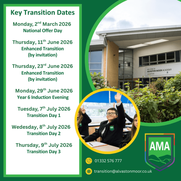 Please be assured of our commitment to helping all our new students prepare and settle as well as we possibly can. If you have any further queries, please contact Mrs Selby via email: transition@alvastonmoor.co.uk