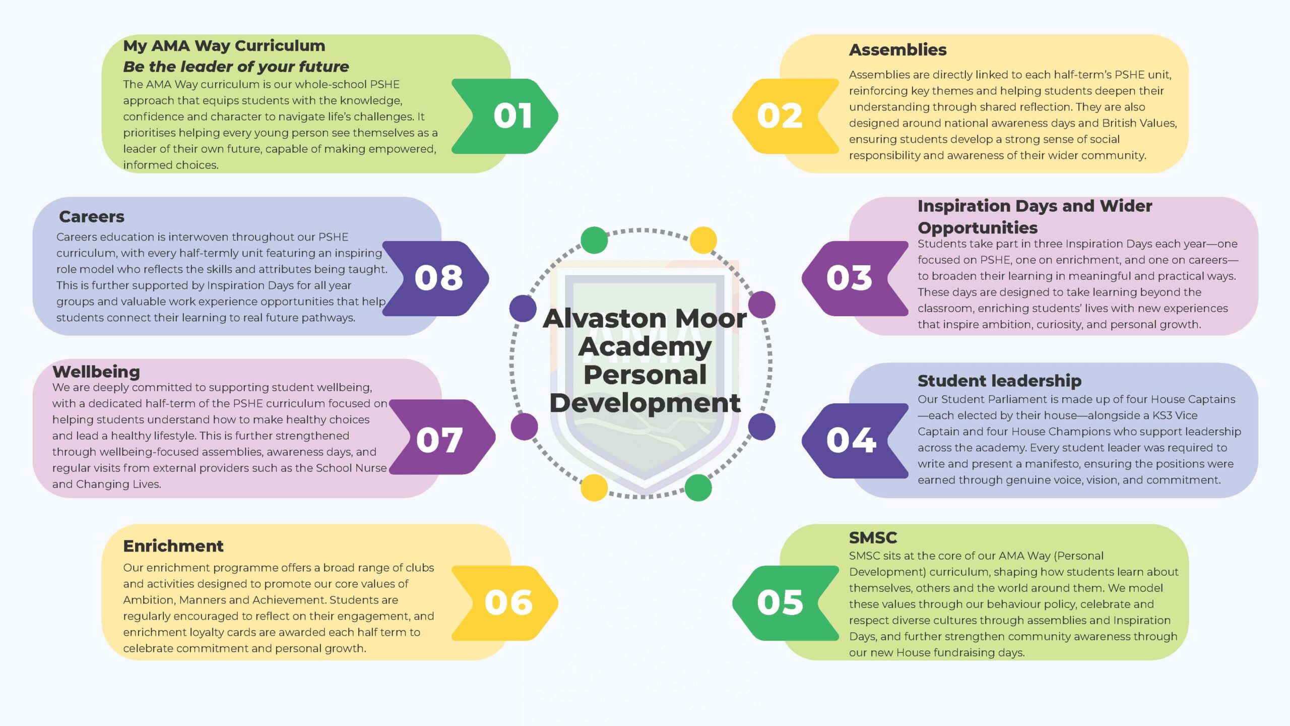 At Alvaston Moor Academy, Personal Development is at the heart of preparing our students for life beyond school. Our curriculum brings together PSHE, careers education, enrichment opportunities, and our new House system, ensuring every student develops the skills, confidence, and resilience needed to thrive in their next steps. Designed around our core values of Ambition, Manners and Achievement, our Personal Development offer not only equips students with knowledge and qualifications but also models the behaviours and attitudes required to become successful, responsible individuals in the wider world. By combining academic guidance with rich opportunities for personal growth, we ensure that every student leaves Alvaston Moor with both choice and opportunity for their future.